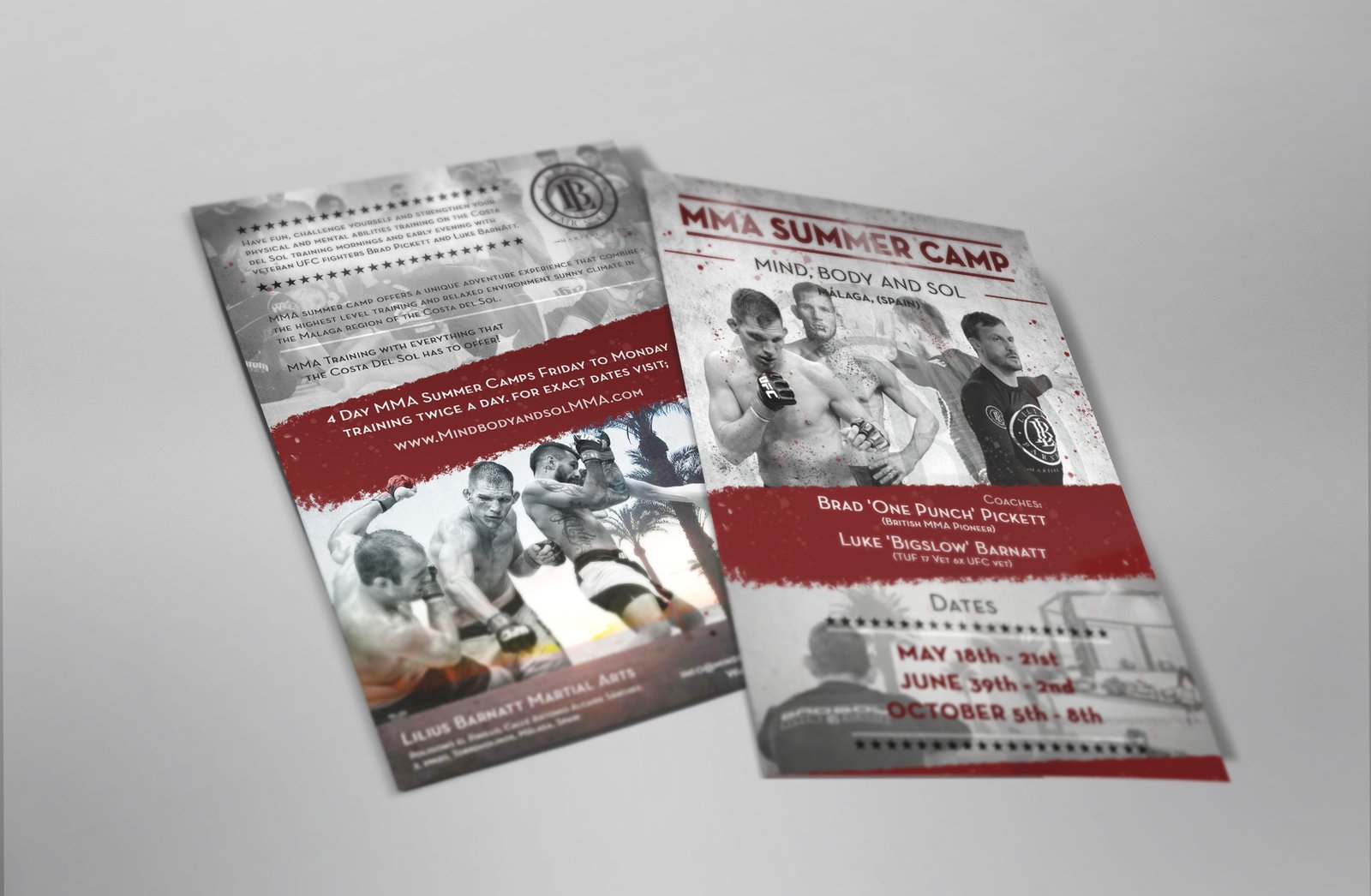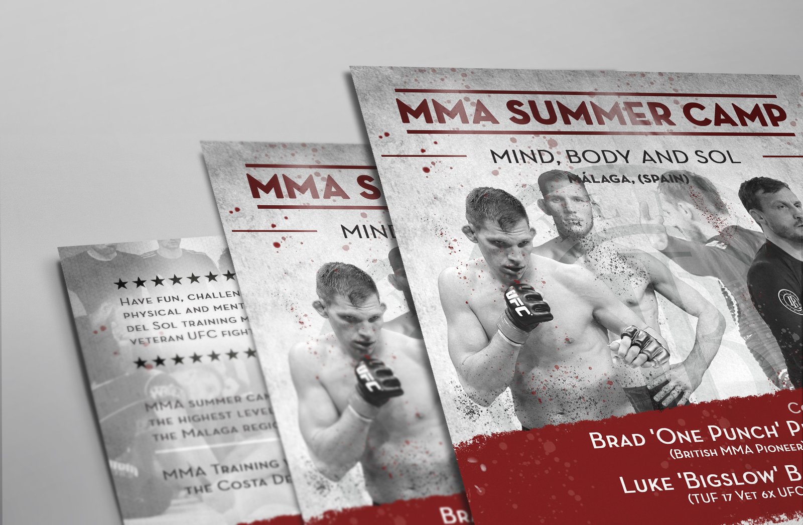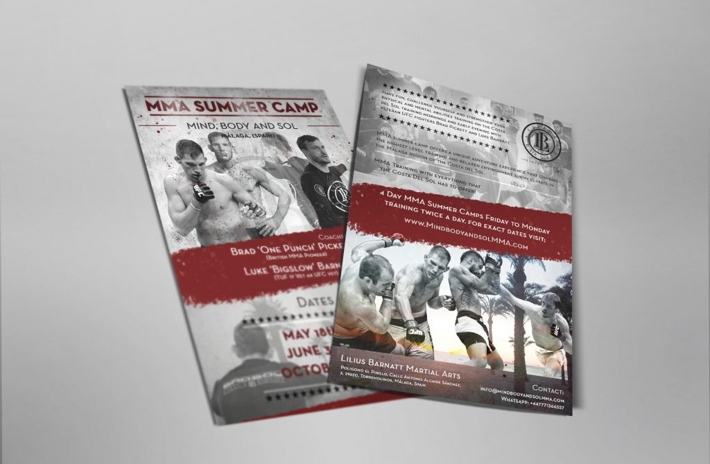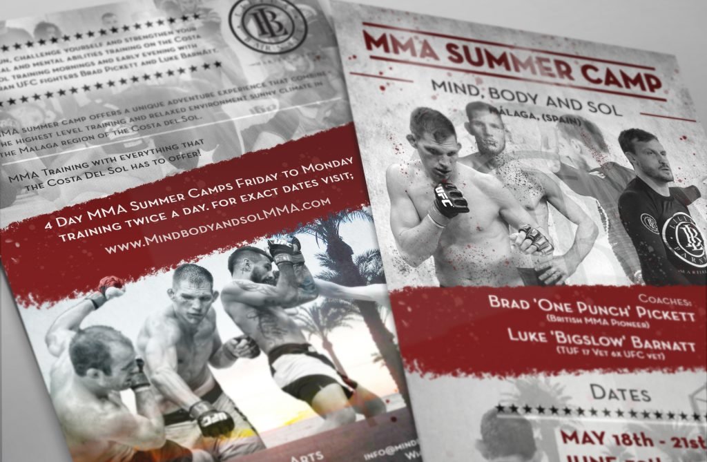 Flyer realizado para un Campamento de Verano de artes marciales centrado en el MMA. Diseño vinculado con la Costa del Sol y la técnica de estas artes a través de las imágenes que aparece en el flyer. También representa visualmente un toque más agresivo mediante las tonalidades de colores empleadas en dicho diseño.