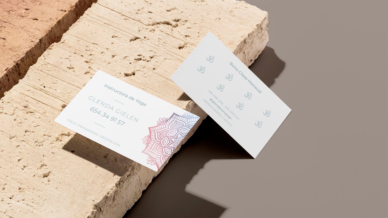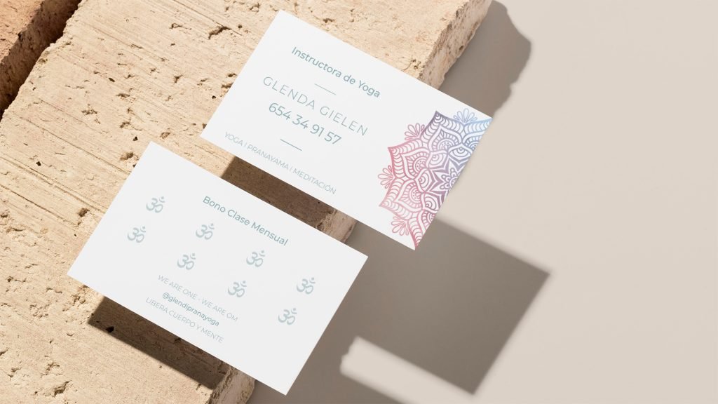 Diseño de colores pasteles donde predomina la mitad de un Mandala dejando la otra mitad libre para la información de contacto.
